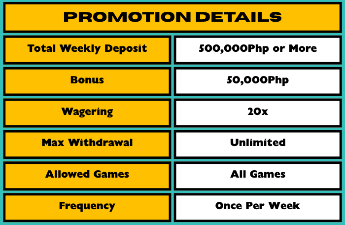 1. Deposit at least PHP 500,000 from Sunday to Saturday. Only weekly deposits are valid.